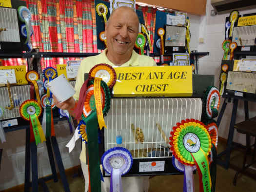 SPECIALIST & RARE VARIETY OPEN SHOW - 2014 The Specialist & Rare Variety Open Show had an increase in entry for its 26th show by avoiding the Silverstone Formula One Racing weekend nearby. This will not be a problem in future for the show as from 2015 onwards the show will always be held during June. This increase in entry was 23% up from last year with a total entry of 592 of which 413 birds were benched from 41 exhibitors. As always, the show committee extends its sincere thanks and gratitude to the following sponsors; Brown & Hutt (50% cost of all the open rosettes for the show); Geoff Capes (cost of all the ceramic awards to the judges and Best of Colours); Mick Anzara, Ian Brickwood, Jan Hill, Grant Findlay & Nick Flavell and Dave & Linda Rafis for their financial sponsorship. Warren Wilson & BRASEA donated major rosettes for all the BOC winners and other colour awards. Frank & Vanessa Barnes & Swindon BS donated a Team show cage and Jim Mitchell a single show cage for the raffle. The show also received sponsorship in the form of bags of seed & products from Rod & Sue Clarke, Norman & June Cox, Johnson & Jeff Ltd, Country Wide Seed and Malcolm & Pam Freemantle. Donated birds for the raffle came from Alan & Gina Adams, Ghalib & Janice Al-Nasser, Grant Findlay & Nick Flavell, Gren & Pat Norris and Terry Sadler. Our Guest of Honour this year to present the 45 trophies was Carlos Ramôa from Portugal who was one of the judges and a friend of the show. Next year's show will be staged on 27th & 28th June 2015 (week 26) at the same venue in Bugbrooke, Northamptonshire. Mick Widdowson (Widdowson & Wilson) with his Best Crest award CRESTS OF QUALITY There was an increase in the crested entry to 51 for Carlos Ramôa to judge. The adult C.C. and eventually the Best Crest in Show went to the new partnership of Mick Widdowson & Brian Wilson with a circular cobalt cock of good size and condition. Robert Brokenshire occupied second place with a circular grey green cock while the Widdowson & Wilson partnership was third with a tufted skyblue cock. Ghalib & Janice Al-Nassers circular yellow hen was best any age opposite sex. Ghalib & Janice won the young bird section with a circular opaline skyblue cock followed by the Widdowson & Wilson partnership with a circular hen. Robert Brokenshire was third with a circular cock.
