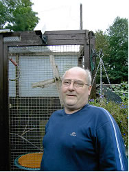 HOUSING Johns budgerigars are housed at the back of a neat garden, behind a fish pond, in a 12 x 8 foot shed; electricity is supplied; the shed is fully alarmed and has security cameras. It is fitted with an air extractor fan and also a dust removing extractor. He has, at his disposal, 26 breeding cases of mixed sizes but generally about 18 x 12 inches, each of which is supplied with either a wooden or plastic nest box fitted to the outside of the cage. John prefers the plastic nest box for hygiene reasons. At the time of my visit some of the cages had their dividers withdrawn and were converted into stock cages; in each stock cage he hangs rope toys, more normally associated with parrots, for the budgerigars to play with. Attached to the shed is an outside flight 8 x 6 foot which is connected to a 3 x 8 foot flight inside. Electric tubular heating is supplied in the winter months to keep the bird room at approximately 68 degrees F. Natural light comes from a double glazed window. THE BUDGERIGARS John started in budgerigars about 12 years ago and still shows as a beginner. That said his crested budgerigars are of good quality and size with many sporting perfect examples of full circular crests and these can certainly hold their own against exhibitors in the higher levels. He was originally introduced to crested budgerigars by Grant Findlay, from whom he obtained his original stock of crests. Grant also obtained for him a pair of crests from Maurice Woodley in Doncaster. No other crests have been brought in; improvements being achieved by the use of outcross normals. John pairs the outcross normal to a good crest and uses the best of the crest bred young into his crests.